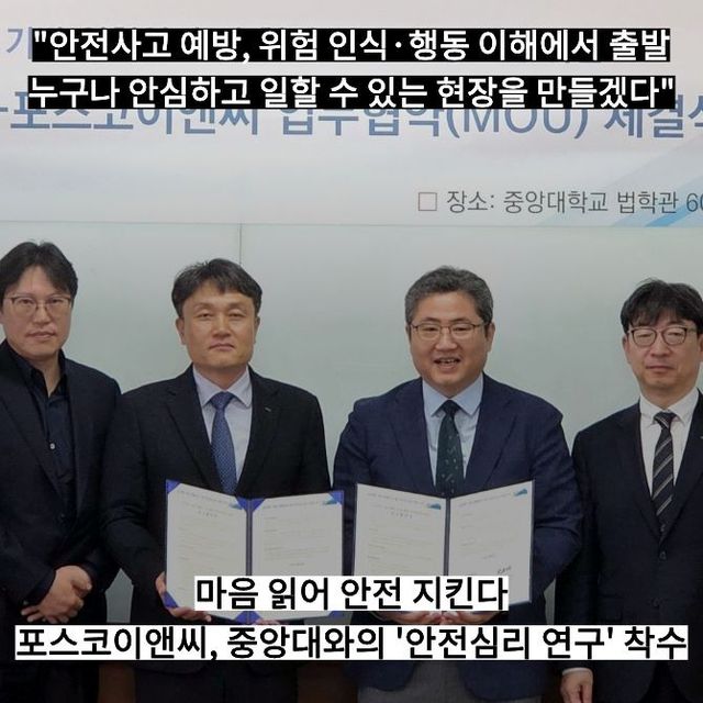 양측은 첫 단계로 포스코이앤씨 고유 '세이프티 아이덴티티(Safety Identity, 이하 SI)' 확립 연구에 착수한다. SI는 안전시설물 색상·형태 등 시각적 요소를 통해 근로자 위험 인지를 유도하는 개념이다. 포스코이앤씨는 연구 결과 바탕으로 표준 안전디자인 기준 등을 마련해 현장에 적용할 계획이다.