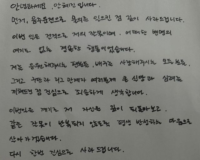 이어 "이번 일을 계기로 자신을 깊이 되돌아보고, 같은 잘못이 반복되지 않도록 평생 반성하는 마음으로 살아가겠다"고 밝혔다.