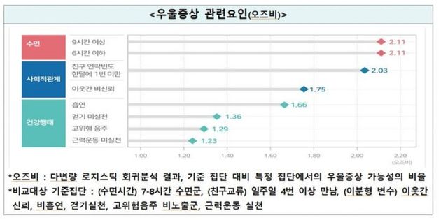 수면의 경우, 하루 7~8시간을 자는 사람과 비교해 6시간 이하 혹은 9시간 이상 자는 이들에게 우울 증상 위험이 2.1배 높았다. 친구와의 교류가 월 1회 미만으로 드문 경우는 2배, 이웃 간 신뢰가 낮은 경우는 1.8배였다.