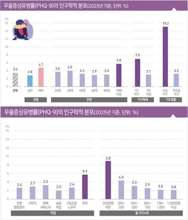기초생활 수급 가구는 미수급 가구 대비 4.6배, 1인 가구는 2인 이상 가구 대비 2.3배, 월 소득 200만원 이하는 전체 대비 2.6배 높은 수치를 기록했다. 70대 이상 1인 가구의 유병률은 8.9%로 전체의 2.6배에 달해 집중적인 정책 지원이 필요한 것으로 나타났다.