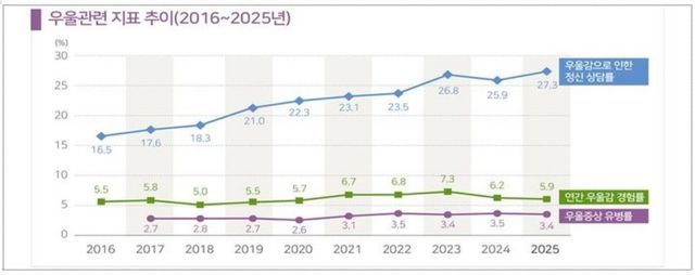 우울증 위험군을 가리키는 우울증상유병률은 2017년 2.7%에서 2025년 3.4%로 25.9% 증가했다. 연간 우울감 경험률은 2016년 5.5%에서 2023년 7.3%까지 오른 뒤 2025년에는 5.9%로 다소 낮아지는 흐름을 보였다.