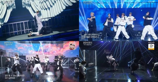 특히 고난도 안무를 완벽하게 소화한 대목이 눈길을 사로잡았다. 멤버들은 물구나무를 선 채 양발을 빠르게 교차하는 ‘정’의 ‘가위차기 댄스’를 자로 잰 듯한 ‘칼각’으로 구현했다. 또 에너제틱한 댄스와 흔들림 없는 고음으로 현장 관객들과 출연진의 폭발적인 함성을 끌어냈다.