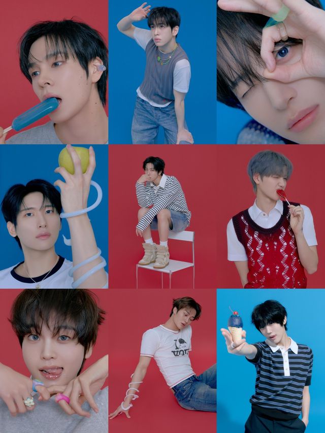 사진 속 멤버들은 단색 배경을 바탕으로 다양한 표정과 포즈를 선보였다. 글리터와 액세서리를 활용해 콘셉트의 분위기를 강조한 점도 눈에 띈다. 단체 컷에서는 레드와 블루가 섞인 퍼플 배경 아래 자유로운 구도를 연출했다. 케이크 형태의 오브제를 활용한 연출로 기념과 축하의 의미를 표현한 모습이다.
