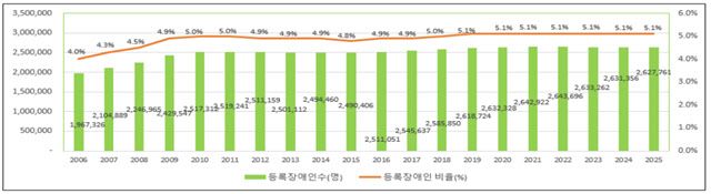 19일 보건복지부의 ‘2025년도 등록장애인 현황 통계’에 따르면 지난해 말 기준 등록장애인은 262만 7761명으로 집계됐다. 전체 인구 대비 5.1% 수준이다.