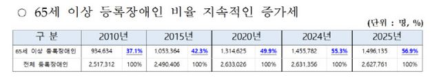 눈에 띄는 변화는 고령화다. 65세 이상 장애인은 149만 6135명으로 전체의 56.9%를 차지했다. 2015년 42.3%, 2020년 49.9%, 2024년 55.3% 등 꾸준히 증가하는 흐름이다. 연령대별로는 60대(23.1%)가 가장 많았고, 70대(22.9%), 80대(17.6%) 순으로 고령층 비중이 압도적으로 높았다.