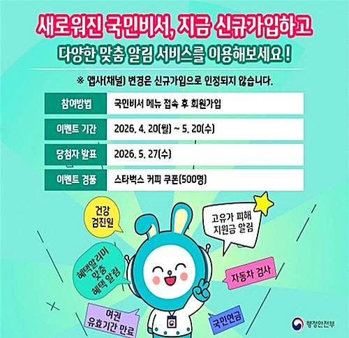 한편 행안부는 이용 활성화를 위해 이달 20일부터 다음 달 20일까지 신규가입 이벤트를 실시한다. 추첨을 통해 500명에게 음료 쿠폰이 증정된다.