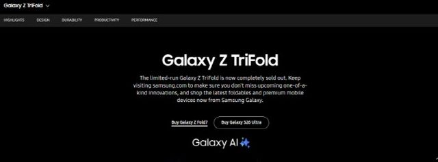 삼성전자 미국 공식 스토어는 지난 17일(현지시간) “한정판 갤럭시Z 트라이폴드는 이제 완전히 매진됐다”며 “삼성의 다른 최신 폴더블 및 프리미엄 모바일 기기를 쇼핑해달라”고 공지했다.
