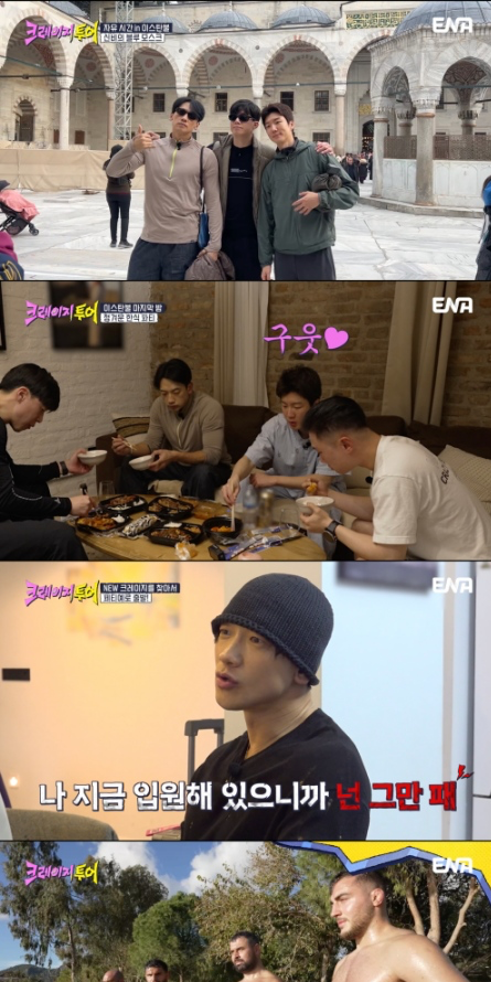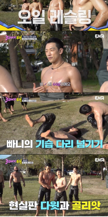 19일 방송되는 ENA ‘크레이지 투어’에서는 비, 김무열, 빠니보틀, 이승훈이 튀르키예 인기 스포츠 오일 레슬링에 나서는 모습이 공개된다.