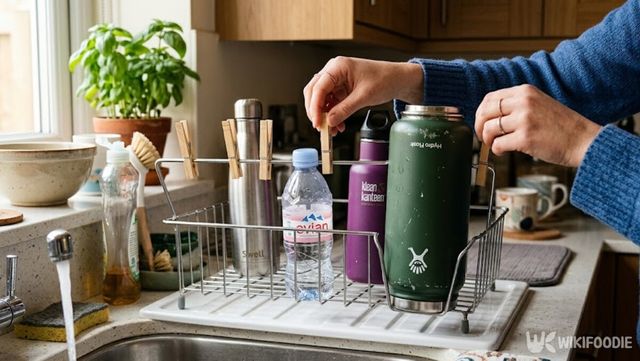 물병을 집게 사이에 고정할 때는 입구가 아래를 향하도록 거꾸로 세우는 것이 맞는 방법이다. 물병 내부에 남아 있는 물기는 입구가 위를 향한 상태에서는 바닥에 고여 있게 되지만, 거꾸로 세우면 중력에 따라 입구 쪽으로 자연스럽게 흘러내려 밖으로 빠져나간다. 공기도 입구를 통해 내부를 순환하게 되어 건조 시간이 눈에 띄게 줄어든다.