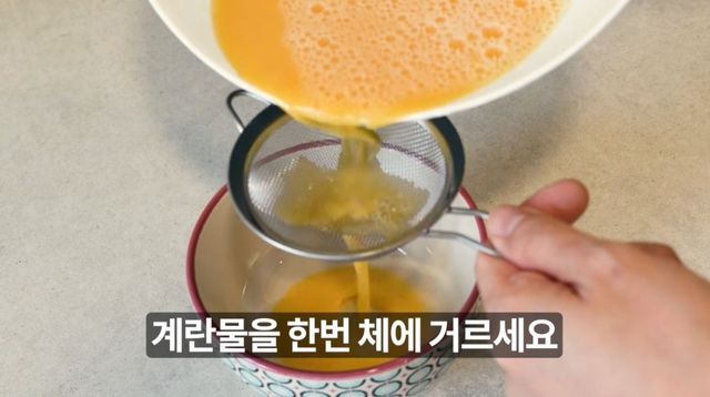 계란물을 채에 거르는 모습. 계란물의 농도가 일정해 지고 불필요한 거품이 제거돼 단면이 매끄럽고 탄력있어져 더 맛있어 진다고 한다. / 유튜브 '리꼬 Rico'