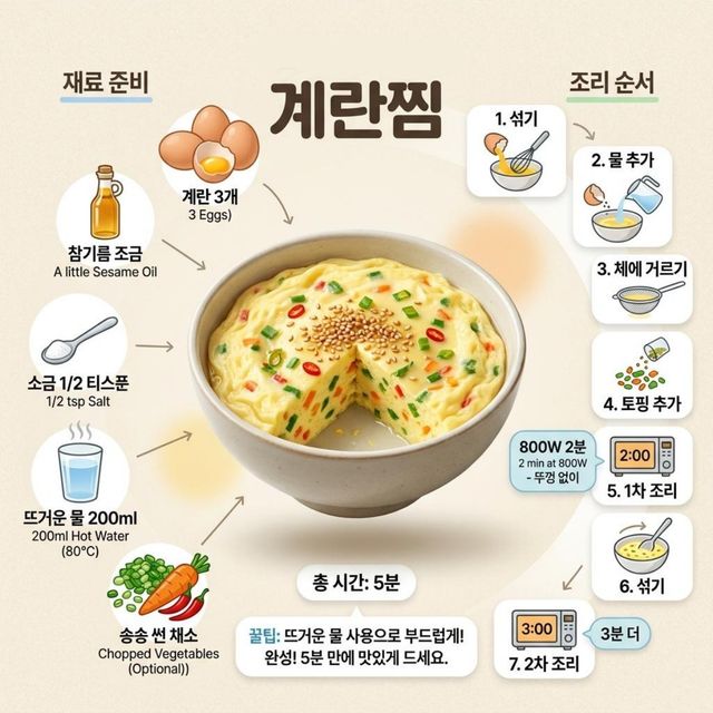 [인포그래픽] 5분 만에 만드는 맛있는 초간단 계란찜 레시피 총정리. AI툴로 생성한 자료사진.