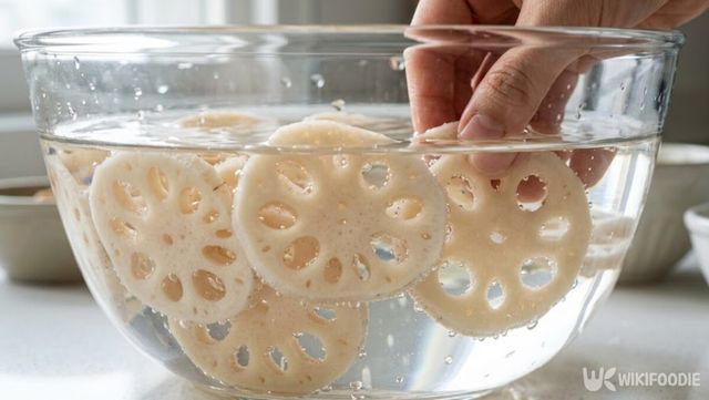 2. 연근을 5mm 두께로 썬 뒤 식초 넣은 물에 담근다.