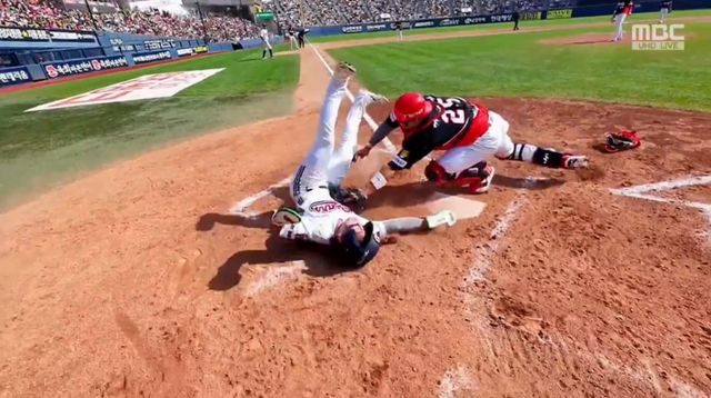 이어 박지훈의 희생 번트로 3루까지 진루한 뒤, 박준순 타석에서 나온 3루수 야수선택 때 과감하게 홈을 파고들었다. 박준순의 3루수 강습 타구를 잡은 김도영은 1루가 아닌 홈 송구를 선택했다. 송구 각도가 충분히 나오지 않은 상황이었지만 이른바 '빨랫줄 송구'로 홈을 향해 공을 뿌렸다. 타이밍상 아웃이 유력해 보였다. 원심 역시 아웃. 그러나 비디오 판독 결과, 박찬호가 몸을 비틀어 포수 태그를 절묘하게 피하는 장면이 확인되며 판정은 세이프로 번복됐다. 두산은 2사 2루에서 나온 김민석의 1타점 적시타로 점수 차를 벌렸다.