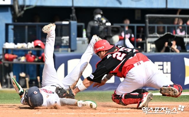 두산은 5회말 선두타자 박찬호의 좌익선상 2루타와 박지훈의 희생번트로 1사 3루 절호의 득점 기회를 맞이했다. 이어 박준순이 3루수 땅볼을 때렸고, 3루 주자 박찬호가 상대 포수 태그를 피하는 감각적인 홈 슬라이딩으로 득점에 성공했다. 원심은 아웃이었지만, 두산 벤치 비디오 판독 결과 박찬호의 손이 홈을 먼저 짚었다.