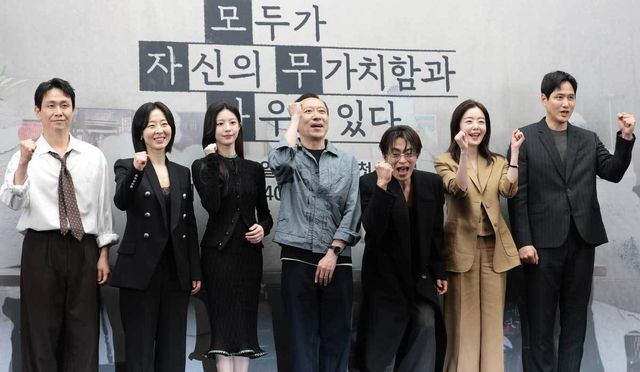 '모자무싸' 파이팅. 배우 오정세(왼쪽부터)와 강말금, 고윤정, 차영훈 감독, 구교환, 한선화, 박해준이 17일 서울 마포구 상암동 스탠포드 호텔에서 열린 JTBC 드라마 '모두가 자신의 무가치함과 싸우고 있다'(이하 모자무싸) 제작발표회에 참석해 포즈를 취하고 있다. '모자무싸'는 잘난 친구들 사이에서 혼자만 안 풀려 시기와 질투로 괴로워 미쳐버린 인간의 평화 찾기를 따라가는 드라마다. / 뉴스1
