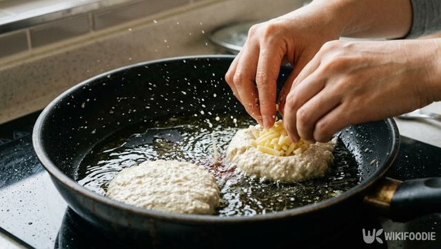 팬에 올리브유를 듬뿍 두르고 중불에서 예열한다. 기름이 넉넉해야 전분기가 바삭하게 튀겨지듯 구워진다. 반죽을 적당한 크기로 올리고 그 사이에 치즈를 넣어 앞뒤로 노릇하게 굽는다.