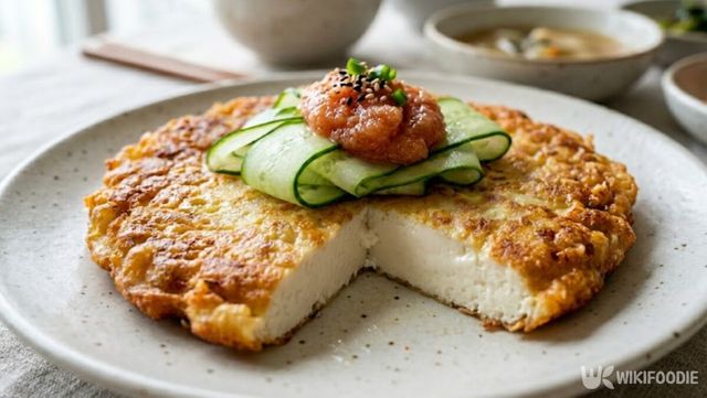 마지막으로 접시에 전을 옮겨 담고, 얇게 썬 오이와 명란젓을 고명으로 올리면 완성된다. 한입 베어 물면 전분의 바삭함이 먼저 느껴지고, 곧이어 연두부와 치즈의 부드러움이 입안 가득 퍼진다.