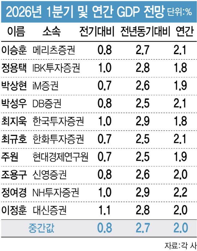 전문가들은 올해 연간 성장률을 2.0%로 전망했다. 이는 지난해 4분기 설문조사 결과와 동일한 수치로 이란 전쟁의 하방 압력을 반도체와 추가경정예산(추경) 편성이 상쇄할 것이란 이유에서다. 다만 하반기로 갈수록 성장률을 점차 낮아질 것으로 예상했다.
