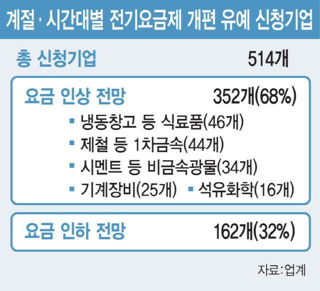 19일 이데일리가 입수한 정부의 계절·시간대별 요금제 개편 유예신청 현황 자료에 따르면 514개 유예신청 기업 중 당국이 요금 상승을 예상한 352개사는 대부분 24시간 연속 공정, 야간·새벽 전력 의존 업종 기업이었다.