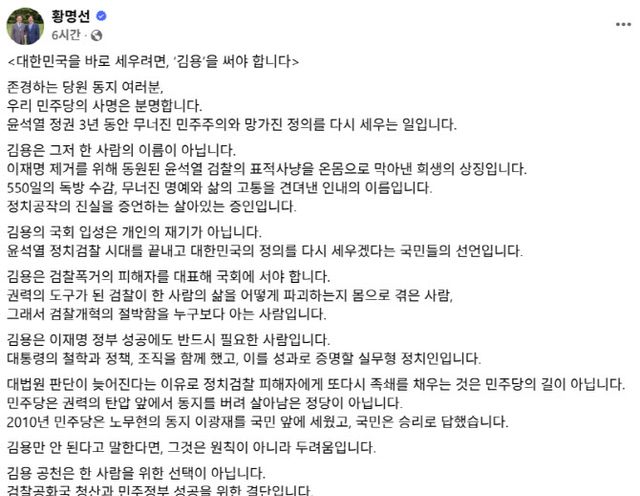 이어 “김용은 검찰 폭거의 피해자를 대표해 국회에 서야 한다. 권력의 도구가 된 검찰이 한 사람의 삶을 어떻게 파괴하는지 몸으로 겪은 사람, 그래서 검찰개혁의 절박함을 누구보다 아는 사람”이라고 덧붙였다.