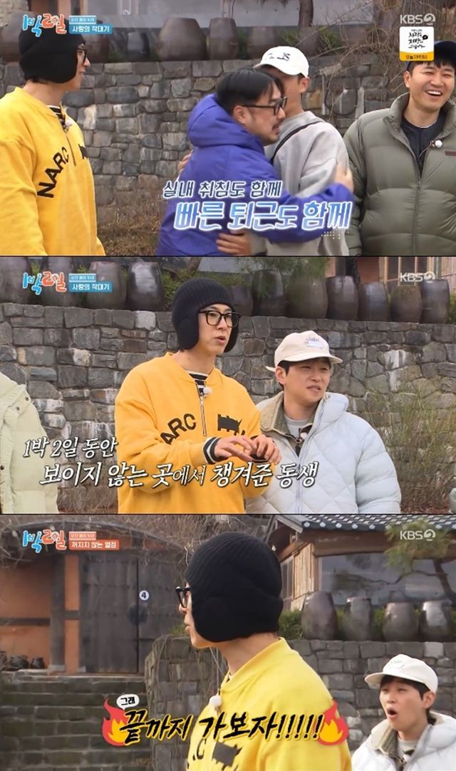 강재준은 '1박 2일'은 프로그램 특성상 금방 친해지는 것 같다면서 "다 보고 싶어서 어떻게 하느냐"고 촬영이 끝나기도 전에 아쉬워했다.