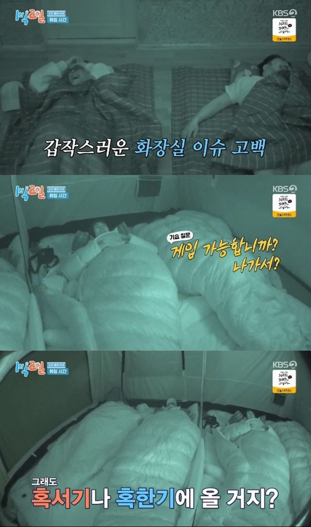 강재준은 코골이에 이어 잔뇨가 있어서 중간에 화장실 갈 수도 있다고 고백했다. 이준은 "최악"이라며 실내취침이 벌칙 같이 된 상황에 웃음을 터트렸다.