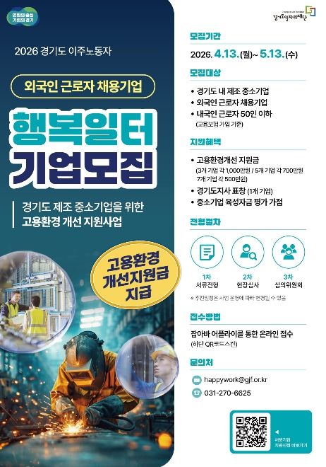 [파이낸셜경제=김영란 기자] 경기도와 경기도일자리재단은 도내 외국인 근로자를 고용한 중소 제조기업을 대상으로 ‘2026년 경기도 이주노동자 행복일터 선정사업’ 참여기업을 모집한다고 20일 밝혔다.
