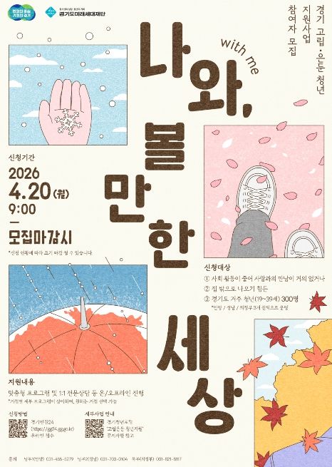 [파이낸셜경제=김영란 기자] 경기도가 사회적 관계가 단절된 고립·은둔 청년의 일상 회복을 돕기 위해 20일부터 ‘경기 고립·은둔 청년 지원사업: 나와(with me), 볼만한 세상’ 참여자 300명을 모집한다.