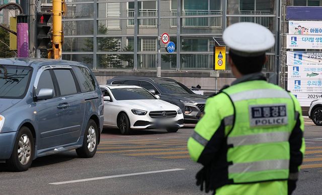 경찰이 우회전 차량 일시정지 위반 단속을 하고 있다 / 뉴스1