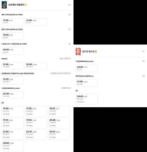 용산아이파크몰 CGV 상영시간표. 프로젝트 헤일메리와 힌드의 목소리 상영관 차이. / CGV 캡처