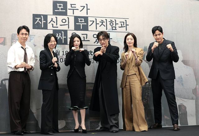 배우 오정세(왼쪽부터)와 강말금, 고윤정, 구교환, 한선화, 박해준이 지난 17일 서울 마포구 상암동 스탠포드 호텔에서 열린 JTBC 드라마 '모두가 자신의 무가치함과 싸우고 있다'(이하 모자무싸) 제작발표회에 참석해 포즈를 취하고 있다. '모자무싸'는 잘난 친구들 사이에서 혼자만 안 풀려 시기와 질투로 괴로워 미쳐버린 인간의 평화 찾기를 따라가는 드라마다 / 뉴스1