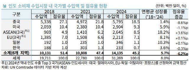 이런 상황에서 K-소비재 진출이 지금이 적기라는 분석이 나온다. 인도 소비재 시장에서 가장 많은 비중을 차지하는 중국의 점유율이 지속적으로 하락하는 추세를 보이고 있어서다. 인도 소비재 수입시장에서 중국의 점유율은 2018년 27.1%에서 2024년 18.5%로 6년새 9%p 가량 하락했다. 중국을 상대로 한 반덤핑 관세 강화, 인도표준국(BIS) 강제 인증 확대 등이 영향을 끼친 것으로 해석된다.