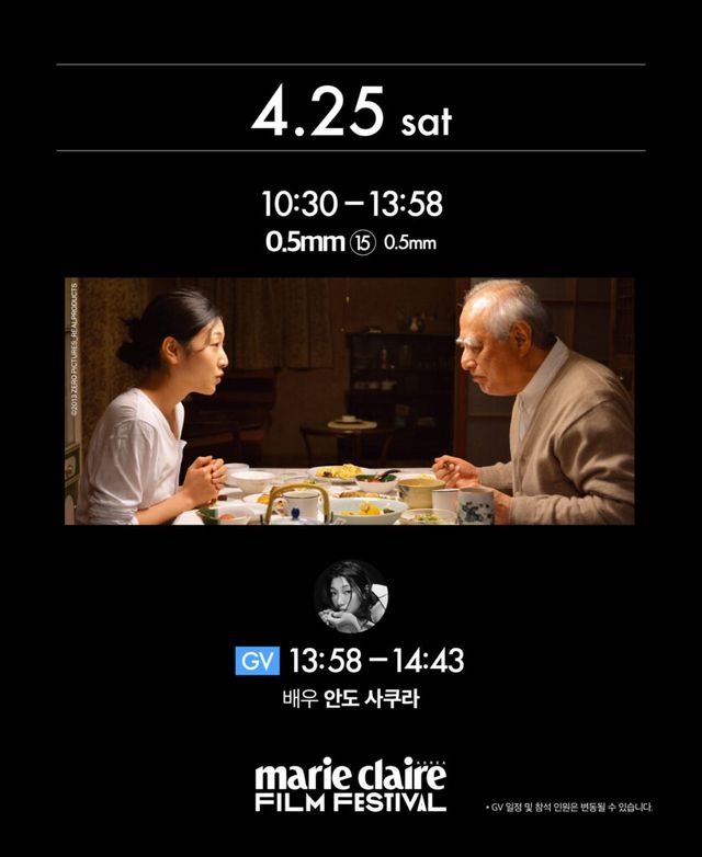 제13회 마리끌레르 영화제 2일차인 25일(토)에는 올해 영화제의 앰배서더로 선정된 안도 사쿠라 배우의 영화 <0.5mm> 상영과 함께 배우가 직접 참여하는 GV가 예정되어 있습니다. 이어 배우 특별전 섹션의 일환으로 <해탄적일천> 상영에 이어 전여빈 배우가 관객과의 만남을 가질 예정입니다. 감독 특별전 섹션에서는 영화 <킹메이커>를 만든 변성현 감독이 참여하는 GV가 진행됩니다.