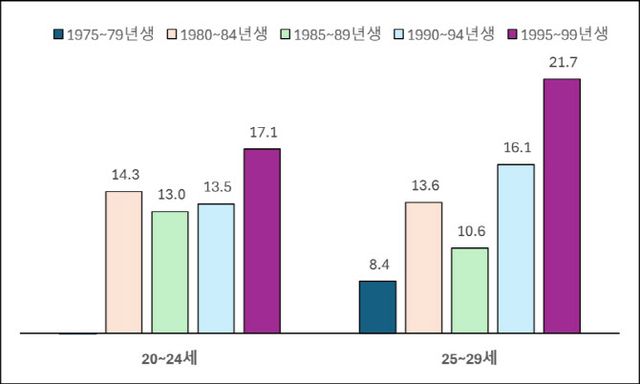 특히 쉬었음 청년 증가는 대졸 이상 고학력자가 주도하는 모습이다. 세대별 비교에서도 증가 폭은 뚜렷하다. 1975~1979년생이 25~29세였던 2004년 8만 4000명 수준이던 쉬었음 인구는 1995~1999년생이 같은 연령대에 해당하는 2024년엔 21만 7000명으로 급증했다.