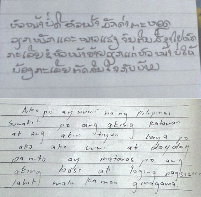 "저는 이제 필리핀으로 돌아가겠습니다. 몸과 배가 너무 아파서 집으로 돌아가려고 합니다. 제 사장은 심술궂고, 제가 아무 잘못을 하지 않아도 항상 소리를 지릅니다."(전직 필리핀인 직원 A 씨)