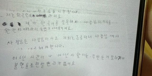 최근 직장내괴롭힘을 신고하며 투·후에 씨는 회사를 떠난 이주노동자 2명에게 진술을 부탁했다. 이들은 공장을 떠나야 했던 사정을 글로 털어놨다.