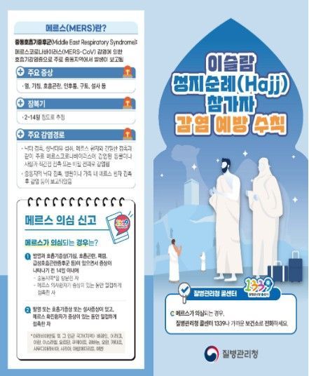 [와이뉴스] 질병관리청은 이슬람 성지순례(하지, Hajj, 2026년 5월 25일~5월 30일 변동 가능) 시기를 맞아 사우디아라비아 방문객들에게 중동호흡기증후군(Middle East Respiratory Syndrome, 메르스) 및 수막구균 감염증(Meningococcal disease)을 주의할 것을 당부했다.