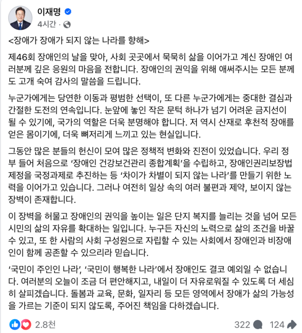 이날 이 대통령은 SNS를 통해 "사회 곳곳에서 묵묵히 삶을 이어가고 있는 장애인 여러분께 깊은 응원을 보낸다"며 장애가 장애가 되지 않는 나라를 향해 국가의 책임을 다하겠다"고 강조했다.