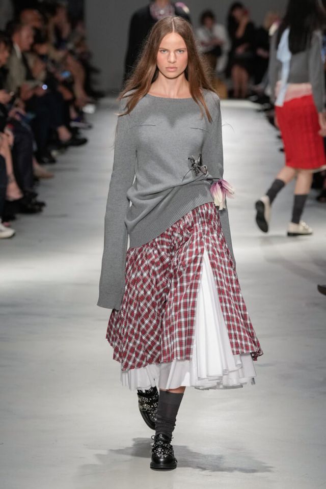 KEYWORD 레이어링, 체크 스커트, 걸코어, 그레이 스웨터