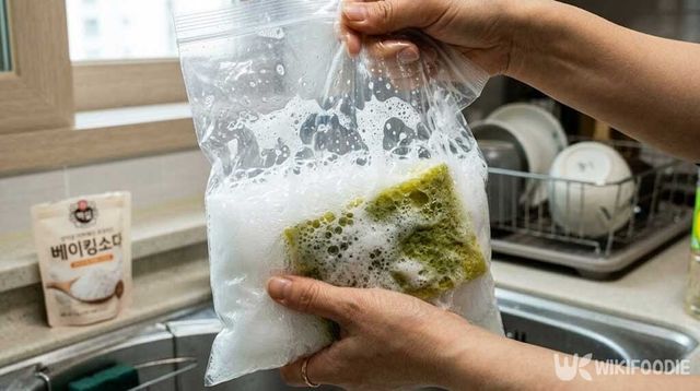 혼합할 때 그릇을 쓰면 손에 묻기 쉬운데, 비닐봉지를 활용하면 이 문제를 깔끔하게 해결할 수 있다. 비닐봉지 안에 세 가지 재료와 수세미를 함께 넣고 입구를 묶은 뒤 2분 정도 힘껏 주물러 주면 된다. 봉지째로 흔들거나 눌러주면 수세미 구석구석까지 소독액이 고르게 스며든다. 이 과정이 끝나면 수세미를 꺼내 흐르는 물에 깨끗이 헹구고, 물기를 짠 뒤 햇볕에 건조시키면 마무리된다.
