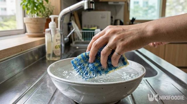 흐르는 물에 적셔도 되지만, 큰 그릇에 물을 받아 수세미를 담근 채로 4회 정도 넣었다 빼는 방식이 물을 더 고르게 흡수시키는 데 효과적이다. 물을 듬뿍 머금은 수세미는 한 번 가볍게 짜주되, 물기를 완전히 제거하지 않아도 된다.