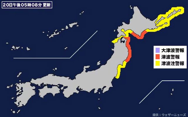 일본 기상청은 최대 3미터 높이의 쓰나미가 홋카이도와 이와테현의 태평양 연안에 곧바로 도달할 것으로 예보하며, 쓰나미 경보를 발령했다. 경보 지역은 홋카이도 태평양 연안 중부와 아오모리현 태평양 연안, 이와테현이다.
