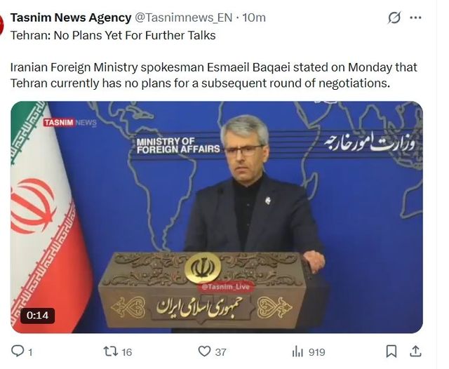 이란 반관영 타스님통신에 따르면 에스마일 바가이 이란 외무부 대변인은 이날 기자회견에서 “현재 차기 협상에 대한 계획은 없다”고 말했다. 바가이 대변인은 “미국이 모순된 행동과 지속적인 휴전 조항 위반으로 외교적 절차 추진에 진정성이 없음을 드러낸다”며 “말과 행동 사이의 명백한 모순은 미국의 의도에 대한 이란 국민의 불신을 심화시킨다”고 했다. 그는 향후 협상 가능성에 대해 “국가 이익을 최우선으로 삼아 적절한 결정을 내릴 것”이라고 말했다.