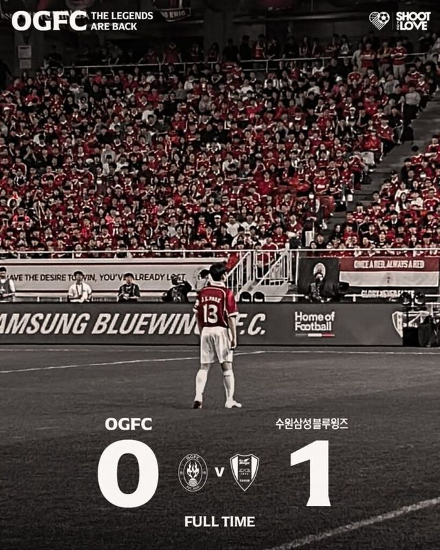 전설들을 응원하기 위해 무려 38,027명의 관중이 수원월드컵경기장을 가득 채웠습니다. OGFC는 그들의 전성기 시절 최고 승률이었던 73% 돌파를 목표로 내세우며 출범했지만, 전반 7분 산토스(Santos)의 결승골을 끝내 넘지 못하고 0:1로 아쉬운 패배를 맞이했는데요. 일부 팬들 사이에서는 은퇴 선수들을 상대로 한 거친 플레이에 대한 지적도 있었으나, 최선을 다하는 수원삼성의 진심 어린 모습이 오히려 경기의 진정성을 더욱 빛나게 했습니다. 비록 결과는 패배였지만 승패를 넘어 그 자체로 오래 기억될 감동적인 경기였습니다.