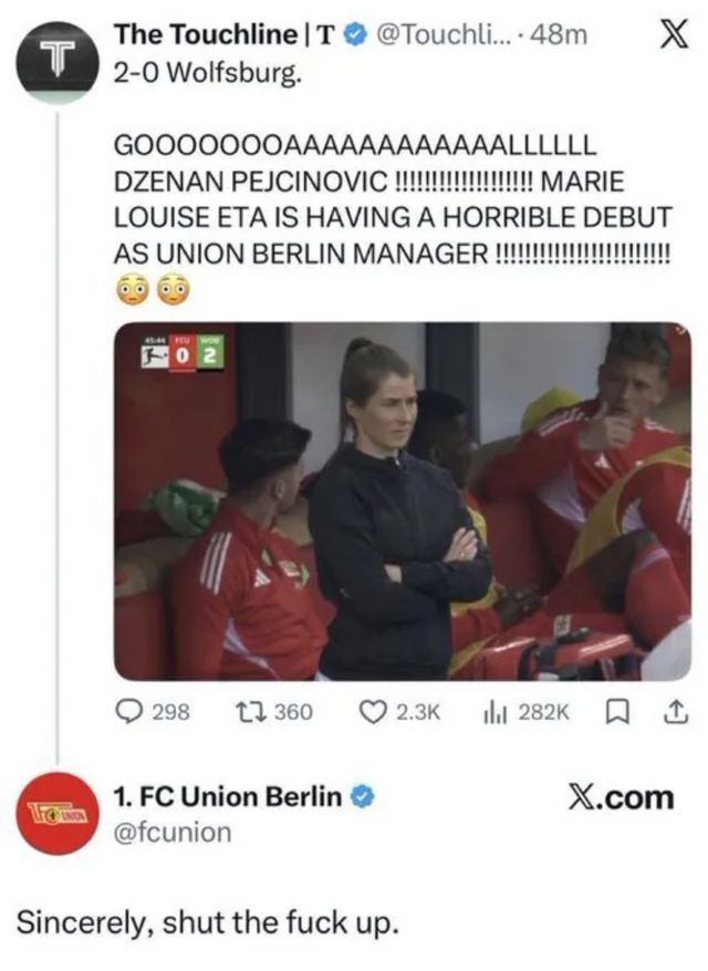 영국 축구 매체 '플래닛 풋볼'은 지난 19일(한국시간) 우니온 베를린이 역사적인 여성 감독의 유럽 빅리그 첫 남자 성인팀 데뷔전을 가진 마리 루이즈 에타를 향해 조롱이 속출하자 '천재적인' 대응을 했다고 보도했다.