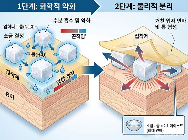 여기에 소금 특유의 거친 입자가 더해지면서 효과가 커진다. 작은 알갱이가 피부와 접착제 사이에 끼어들어 틈을 벌려주고, 문지를 때 자연스럽게 접착제를 밀어낸다. 손에 힘을 주지 않아도 접착제가 조금씩 떨어지는 이유다. 덕분에 별도의 세정제를 쓰지 않아도 부담 없이 제거할 수 있다.