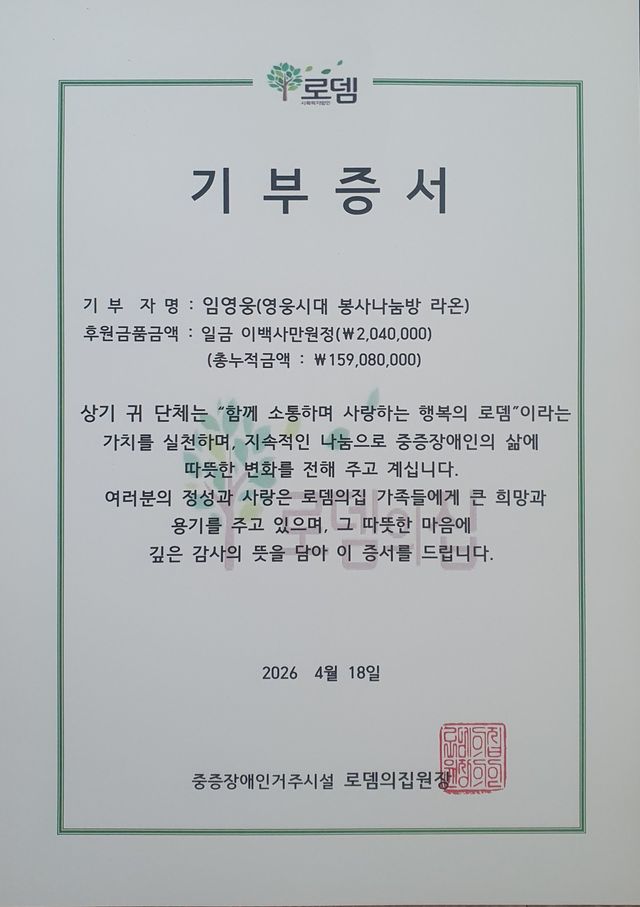 시설 측도 감사의 뜻을 밝혔다. 로뎀의집 이정순 원장은 “매년 라온의 봉사 일정에 맞춰 장애인의 날 행사를 진행하고 있다”며 “정성 가득한 나눔에 깊이 감사드린다”고 말했다.