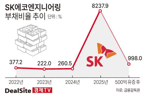 SK에코엔지니어링이 악화된 재무건전성 회복에 난항을 겪고 있다. 지난해 대규모 적자로 이익잉여금이 훼손되며 부채비율이 8000%대로 치솟은 가운데 최근 모회사 SK에코플랜트로부터 500억원을 수혈받았지만, 여전히 부채비율이 1000% 안팎에 머물 것으로 예상되면서 추가 자본 확충 필요성이 제기되고 있다.