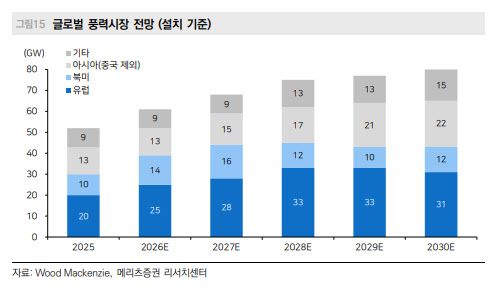 해외 시장도 우호적이다. 유럽은 에너지 안보 위기 속 해상풍력 입찰을 앞당기고 있다. 문 연구원은 2026~2027년 유럽의 연평균 해상풍력 경매 규모가 25GW에 이를 것으로 추정했다. 이는 2021~2025년 평균 12GW의 두 배가 넘는 수준이다. 미국 역시 생산세액공제(PTC) 종료를 앞두고 2026년 풍력 프로젝트 착공이 몰리면서 육상풍력 설치량이 급증할 가능성이 크다고 봤다.