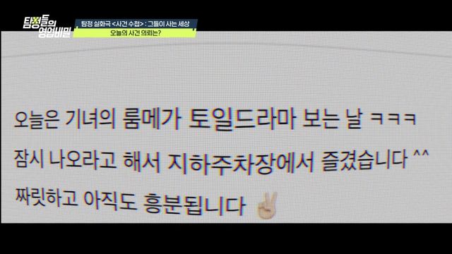 이날 ‘사건 수첩’ 코너에서는 한 의뢰인이 아내의 외도를 의심하며 탐정단에 도움을 요청했다. 발단은 온라인 불륜 카페에 올라온 글이었다. 아파트 지하주차장에서 외도를 즐겼다는 내용과 함께 실제 사진까지 공개돼 충격을 안겼다.